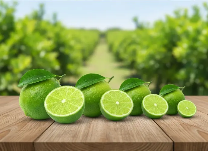 The Persian lime (Citrus latifolia) is a seedless, bright green lime with smooth skin and a mild, tangy flavor. Its juicy flesh, low acidity, and long shelf life make it ideal for cooking, beverages, and export—especially from Mexico, the world’s leading supplier.